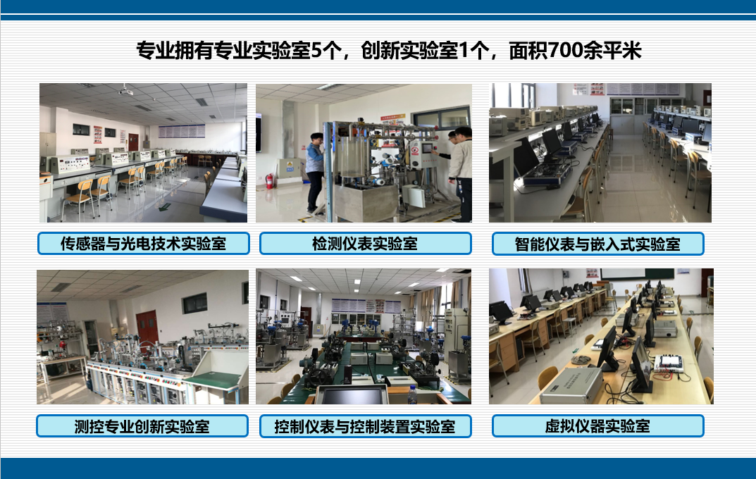 专业拥有六个专业实验室。开设测控专业工程实训、测控专业综合实验、科技创新实践、数学建模实践、单片微机测控系统设计、嵌入式仪器工程设计、测控软件与虚拟仪器课程设计、检测技术综合课程设计等各种实践环节,围绕“生产过程测控系统设计”和“智能仪表与嵌入式仪器”两类复杂工程问题开展学生工程实践动手能力培养,并与各类课外科技竞赛对接,形成课内外科技活动一体化创新实践能力培养新模式。