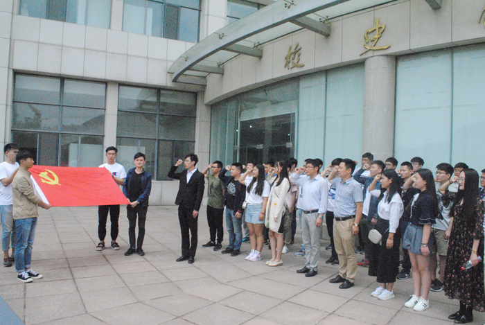 组织毕业生党员在校史馆门前进行了党员宣誓活动,“我志愿加入中国共产党,拥护党的纲领,遵守党的章程,履行党员义务……”在鲜红的党旗前,全体毕业生党员举起右手庄严宣誓,洪亮的声音传遍了整个校史馆,用誓言表达对党的无限忠诚和热爱。入党誓词的十二句话,句句千钧,这不仅是一种形式,更是一种激励,一种鞭策,希望毕业生党员能够“登高望远,脚踏实地”,在未来的工作岗位上绽放党员风采和智慧光芒。