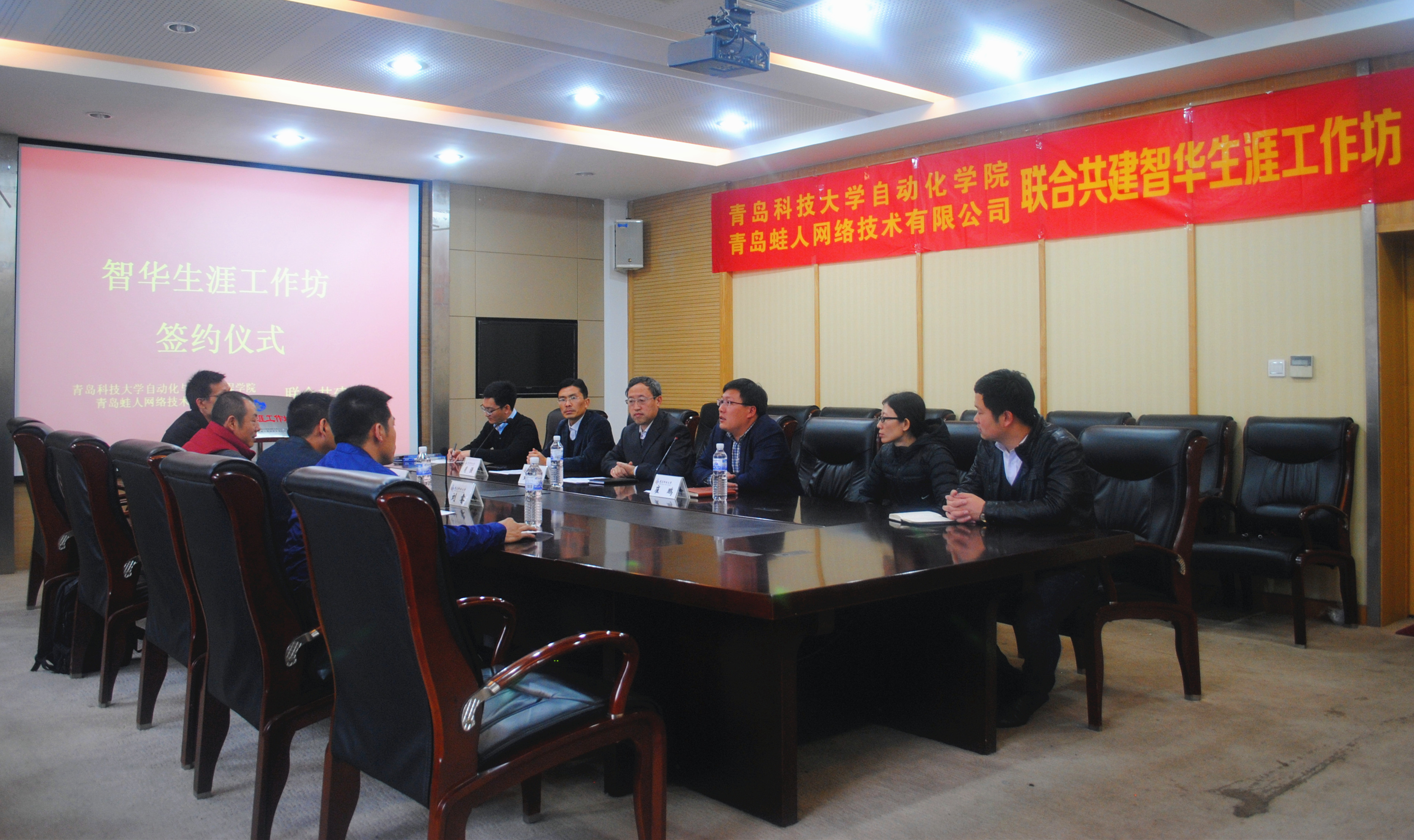 与青岛蛙人网络技术有限公司共建的山东省首家校企合作大学生职业生涯工作坊——“智华生涯工作坊”揭牌仪式在四方校区第一会议室举行。Netflav