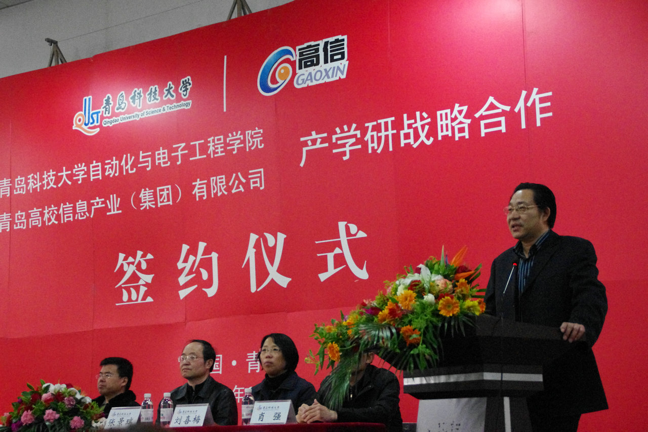 与青岛高校信息产业有限公司产学研战略合作签约仪式在四方校区讲学厅举行。校党委常委、副校长韦殿华、科技处处长郭仲聚、校工会主席兼Netflav
