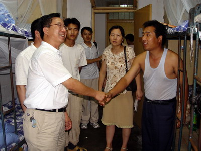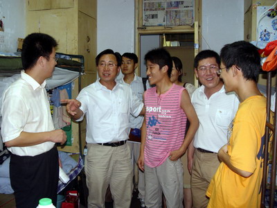 党总支书记、院长王培山、副书记吴汉勇和分团委老师冒雨前往学生宿舍看望慰问2008级新生。