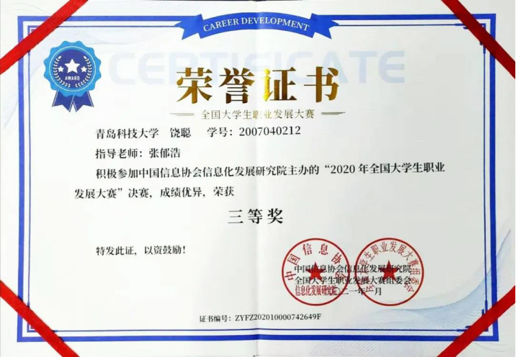 学子饶聪在决赛中荣获全国三等奖。