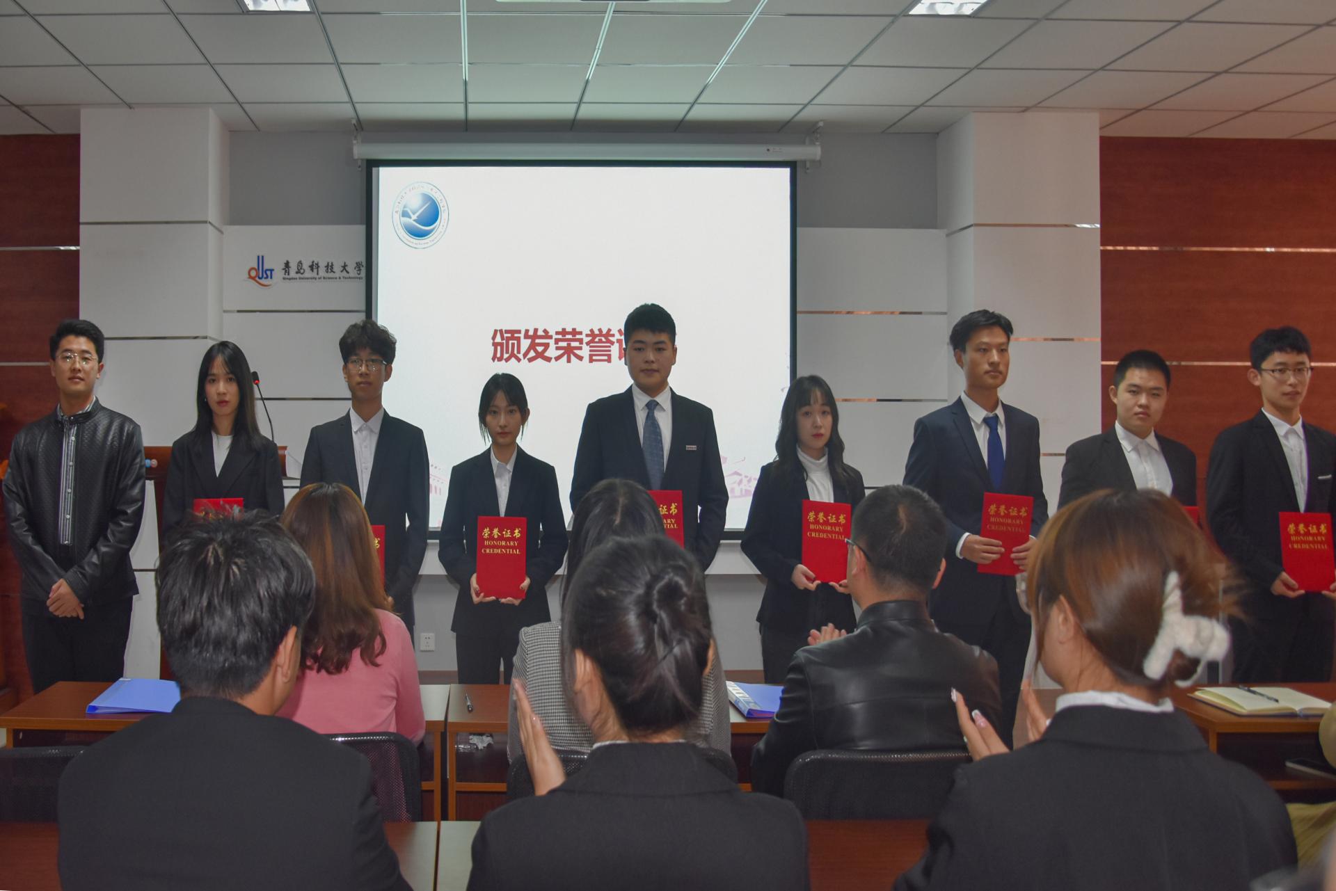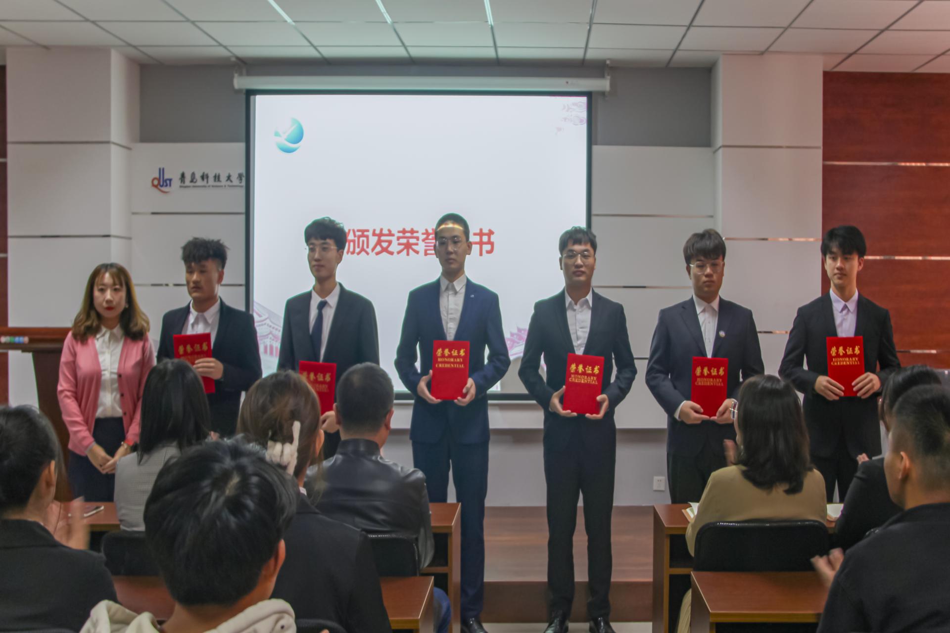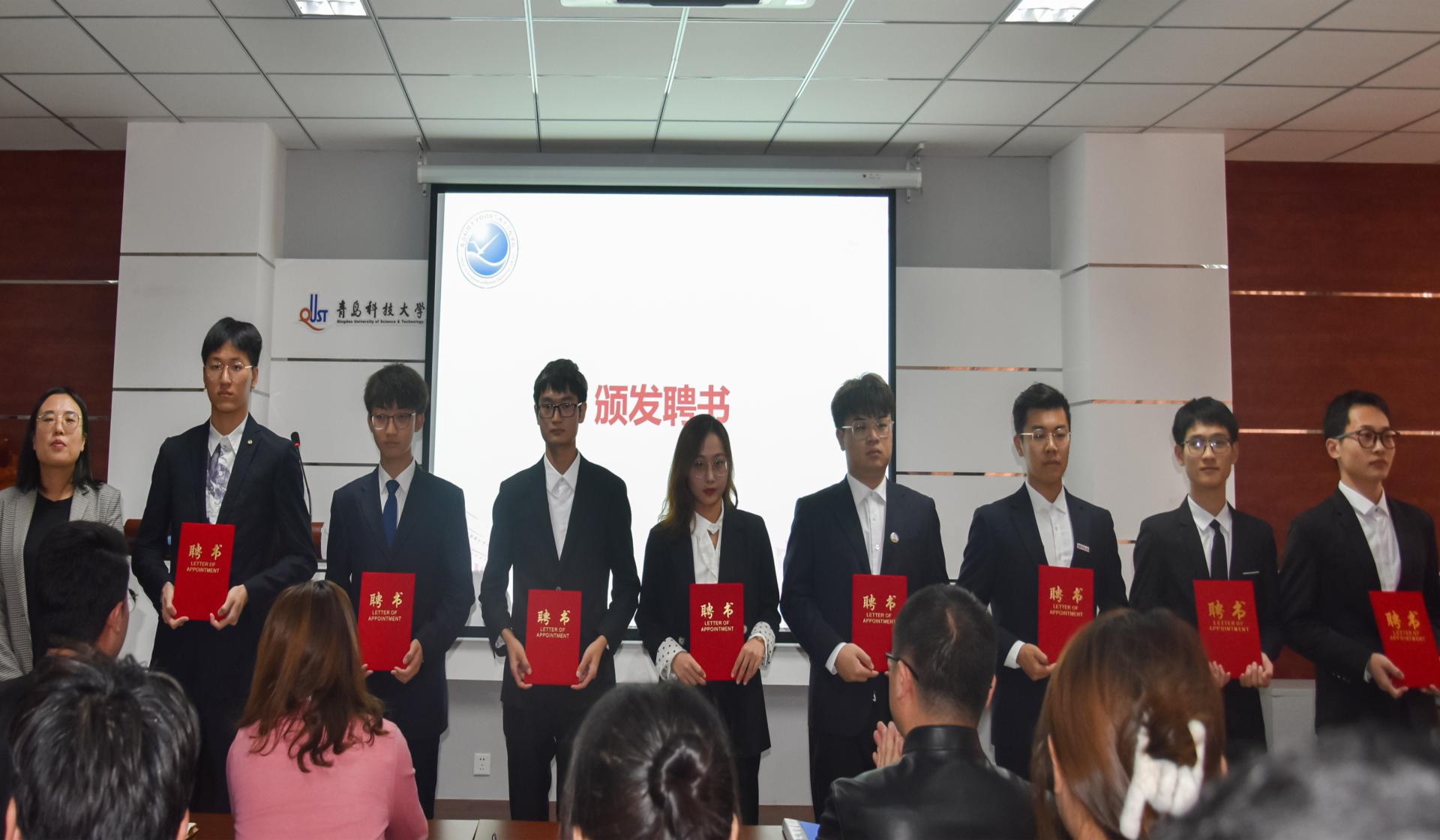 对优秀学生代表进行表彰。团委书记兼学工办主任郭蒙蒙老师为新一届学生会、研究生会主席团、部长团成员代表颁发聘书,团委副书记兼学工办副主任郝雄文老师为学生会、研究生会优秀部长代表颁发荣誉证书,张郁浩老师为学生会、研究生会优秀志愿者代表颁发荣誉证书。