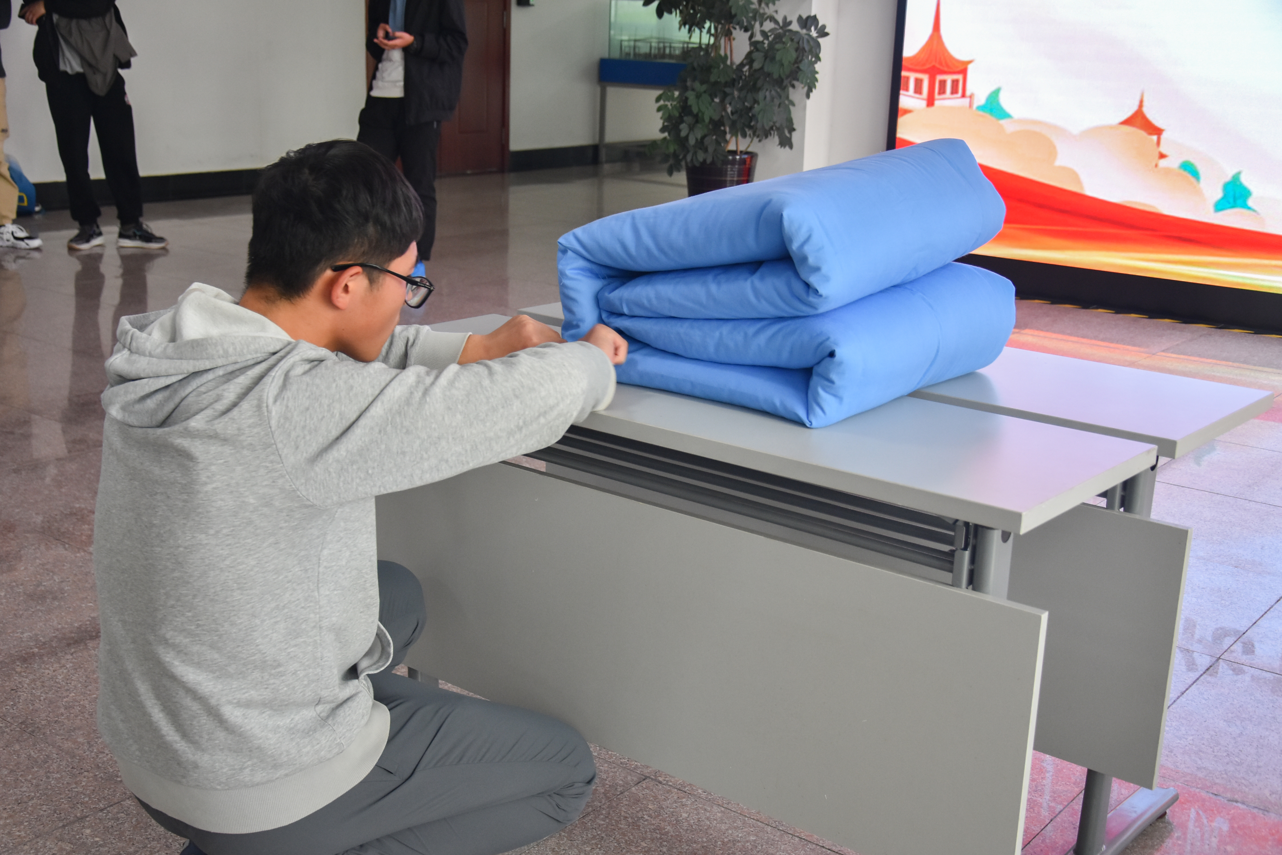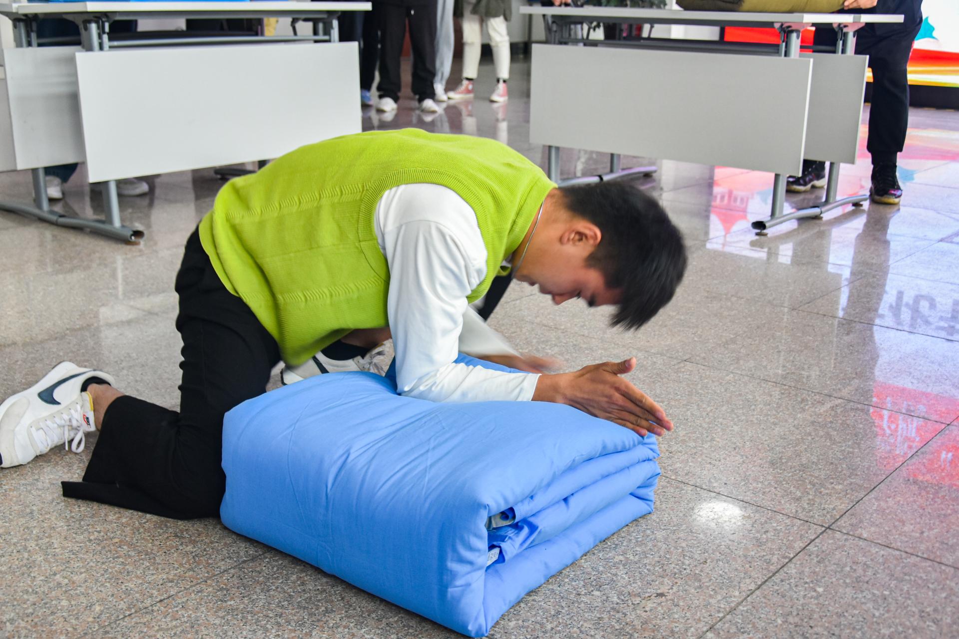 此次比赛参赛选手共分为四组,每组5—6人。选手们全神贯注,精益求精,连贯有序的动作与整齐方正的被子得到了观众们的一致好评。通过现场打分,最终共有10位同学分获一、二、三等奖。