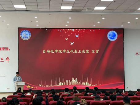 测控194班王庆波代表23届毕业生就实习期间所思所得与在座同学做分享。王庆波表示,在今后的学习生活中,将秉持勤奋好学、积极进取、勇于实践的理想信念,努力成为立大志、明大德、成大才、担大任的时代新人。