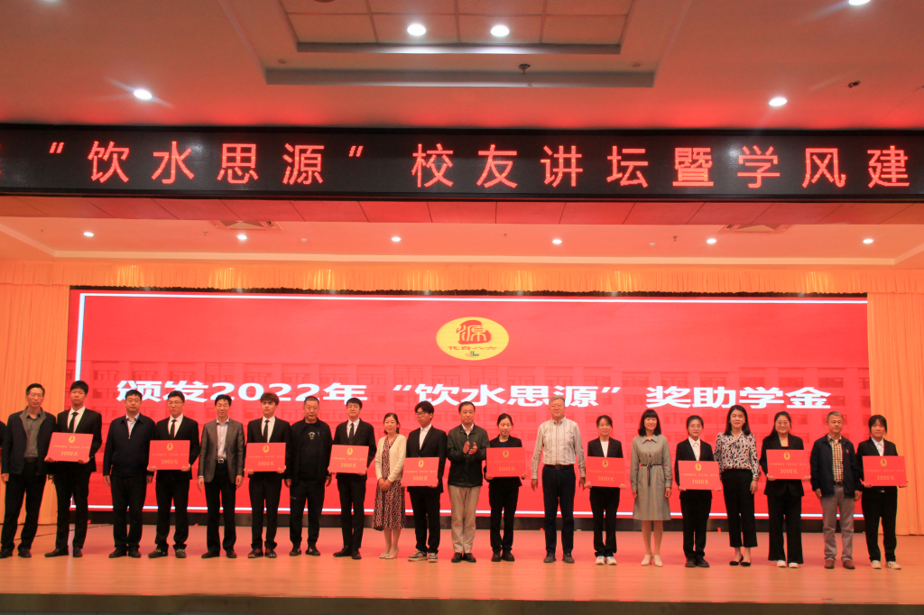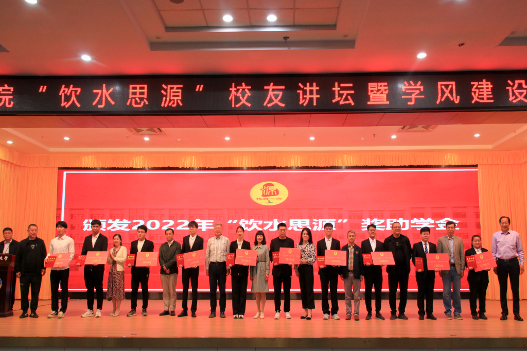 与会领导和校友为2022年“饮水思源”奖助学金获奖同学进行颁奖。