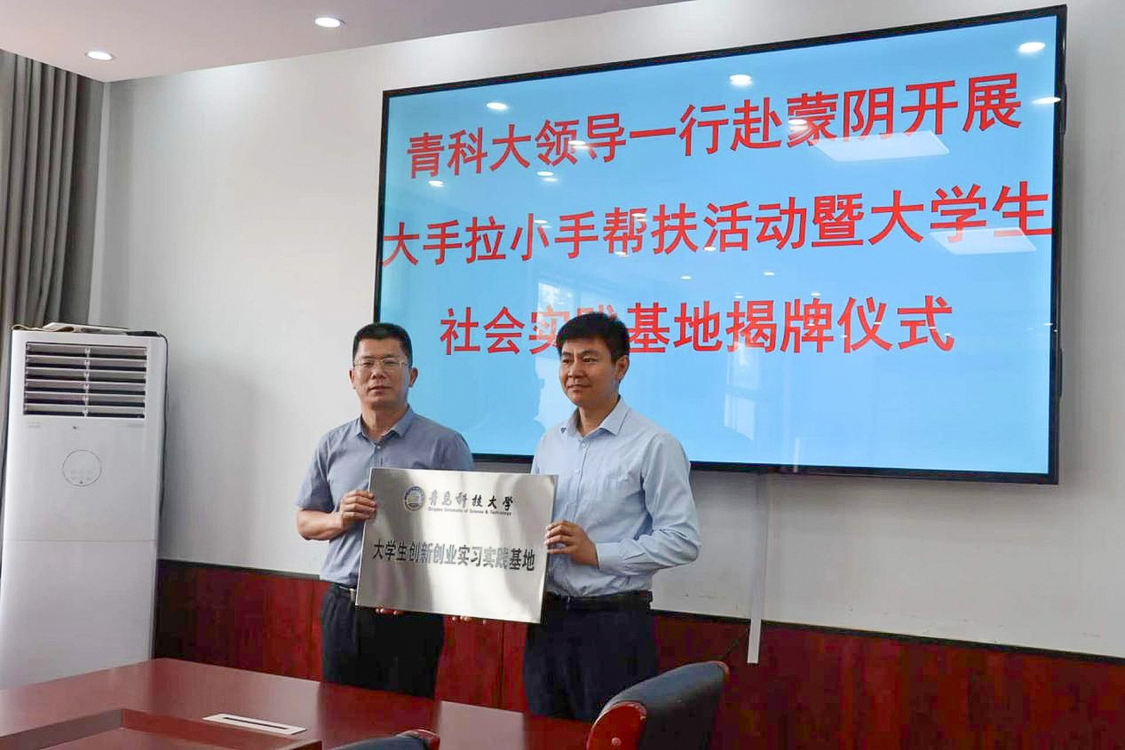 与蒙阴县联城镇签署联建协议,李振与刘名森共同为大学生社会实践基地揭牌。
