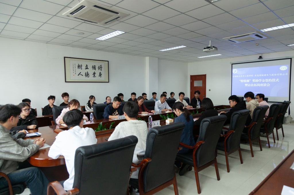楼408会议室联合举办了“特锐德”奖助学金签约仪式暨访企拓岗座谈会。青岛特锐德电气股份有限公司人力资源中心总经理韩增雪、人力资源中心人力总经理助理张莹、Netflav