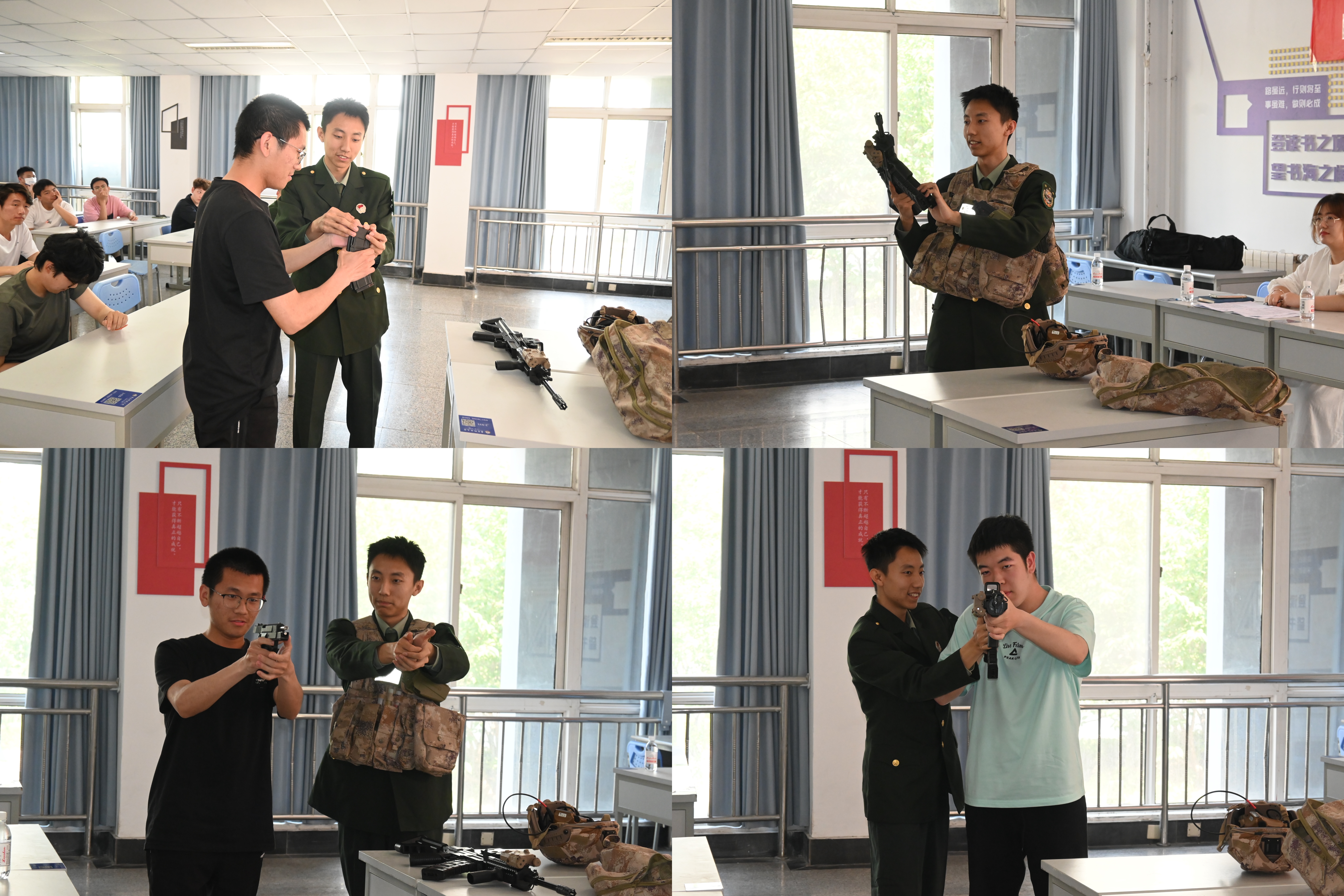 5名退役大学生士兵以军事体验、政策宣讲与职业发展“三位一体”模式进行国防主题宣讲。来自四个年级的退役大学生士兵代表张伟民、丁宁、张培培、崔清成,结合自身军旅生活切片和重返校园后的成长故事,生动讲述了参军带来的成长与收获,具像化展现军事实践对新时代大学生的个人意志品质的淬炼。退役大学生士兵腾耀翔借助先进枪支模型作为教具,为同学带来一场生动的国防知识科普宣讲。手把手教大家体验模拟射击,讲授枪械知识,把一堂沉浸式军事理论体验课带到一站式学生社区。