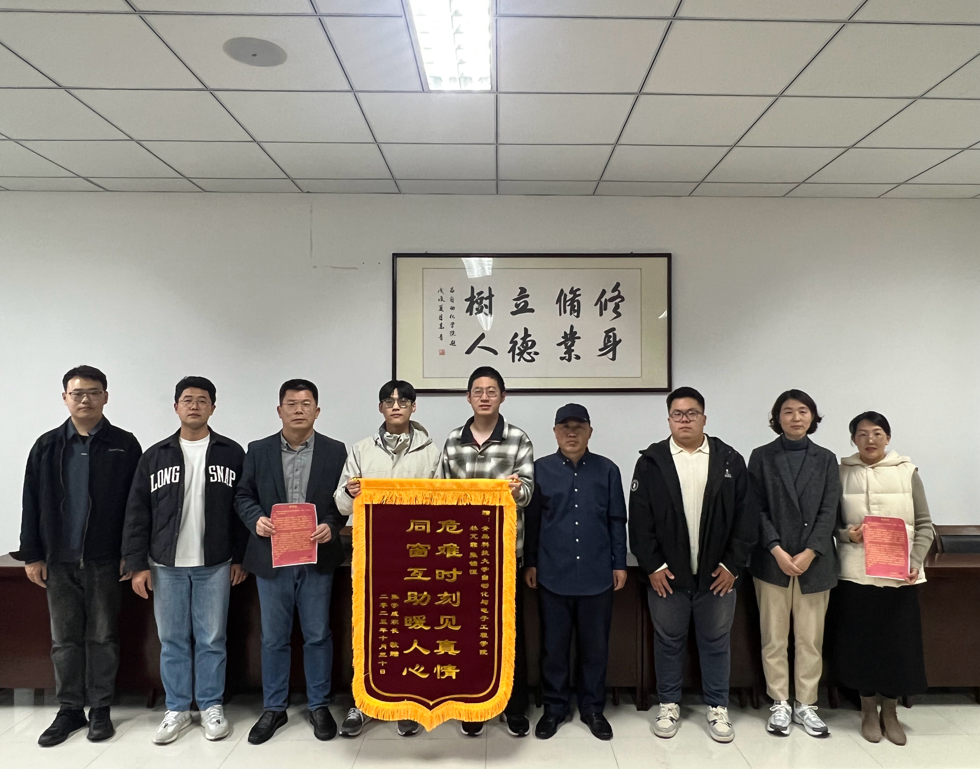 收到了一份来自广东湛江的特殊“礼物”——电气223班学生张学成的家长专程跨省而来,将一面印着“危难时刻见真情,同窗互助暖人心”的锦旗与感谢信,送到了电气223班学生张锦恒、林芃霏手中,以此感谢他们在深夜紧急救助突发急性荨麻疹的儿子,也向Netflav