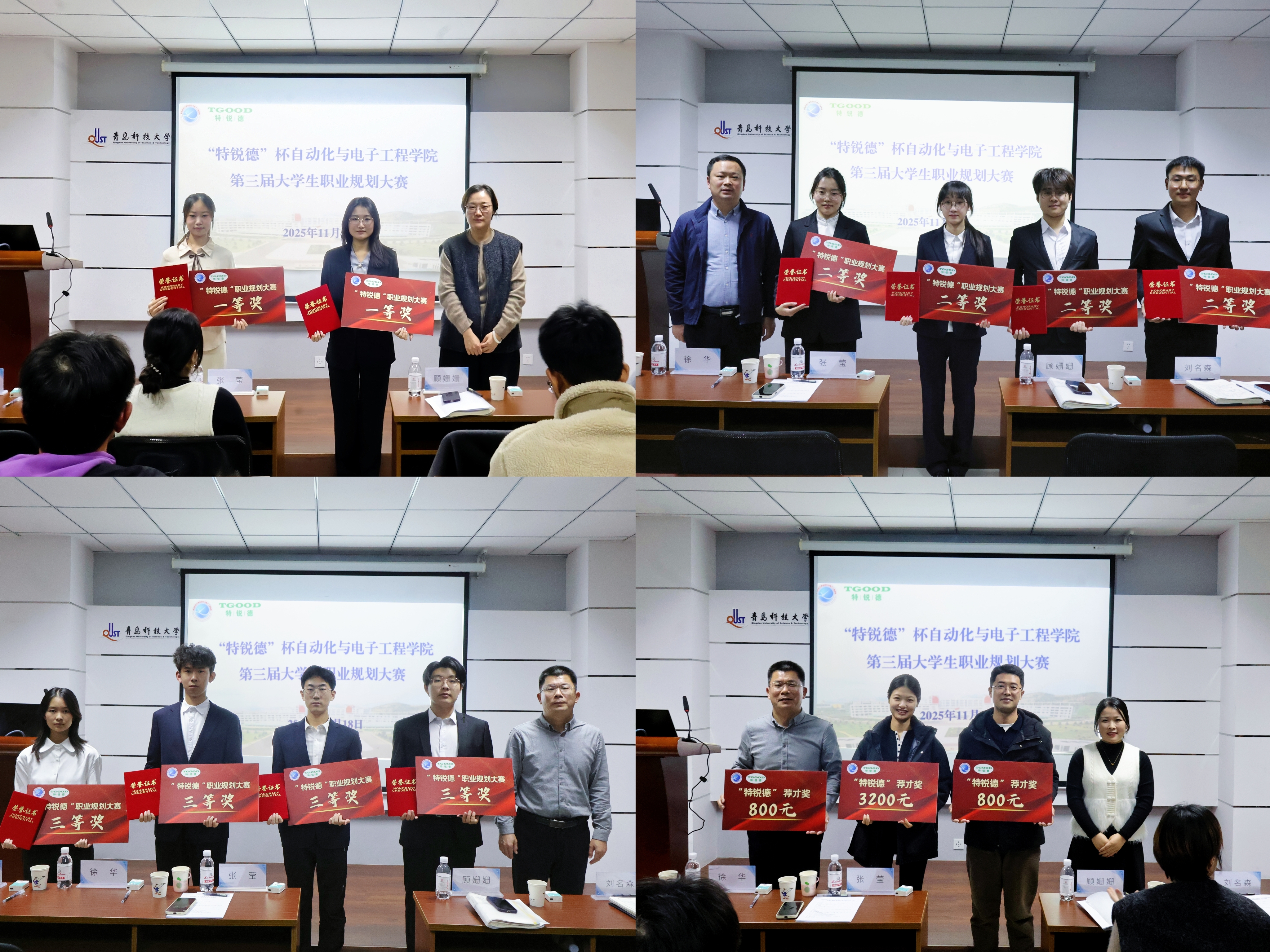 点评环节中,张莹对大赛的组织筹备与选手表现给予高度评价。她结合企业招聘实践与行业发展趋势,从职业素养提升、岗位能力匹配等方面为同学们提供实用建议,鼓励大家立足自身优势,锚定职业方向,在专业领域深耕细作。张莹为获得2025年“特锐德”荐才奖的老师颁奖。顾姗姗、刘海波、刘名森分别为一、二、三等奖获奖选手颁发荣誉证书与奖牌。
