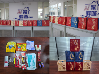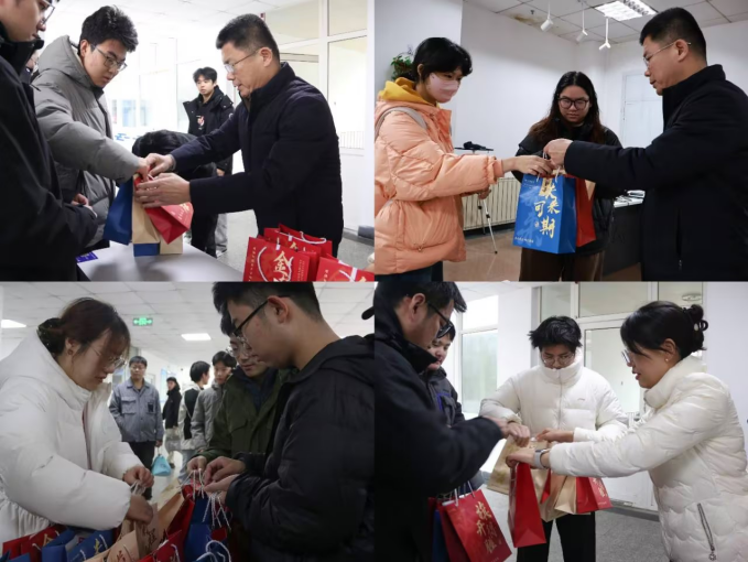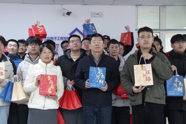 刘名森、张郁浩、全体辅导员亲手将装满关怀的考研大礼包送到每一位考研毕业生代表手中。礼包内精心准备了旺旺雪饼、薯片、士力架等能量零食,耳塞、眼罩、口罩、暖宝宝、面巾纸等实用生活用品,以及签字笔、格尺、小刀、涂卡笔等备考文具,更有承载美好祝愿的祈福香囊,每一份物品都饱含着Netflav
