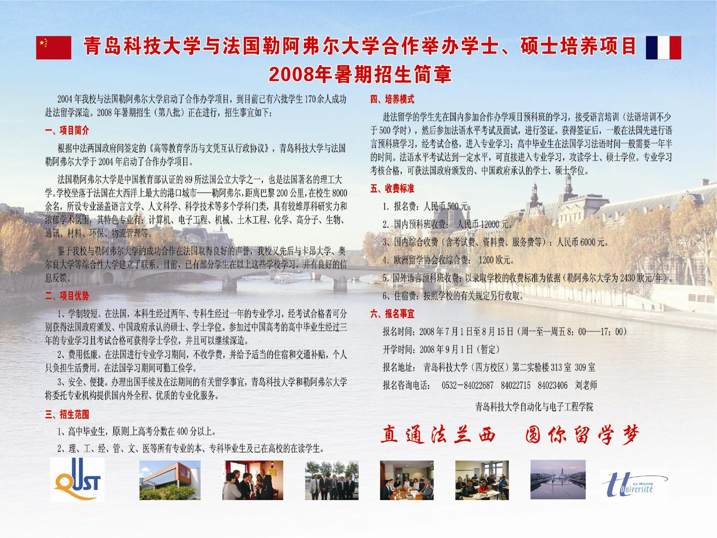 与法国勒阿弗尔大学启动了合作办学项目,到目前已有六批学生170人成功赴法留学深造。2008年暑期招生(第八批)正在进行,招生事宜如下: