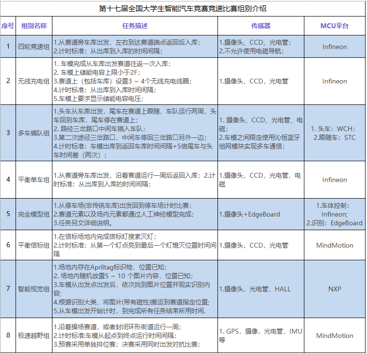 备注:2022年第十七届全国大学生智能汽车竞赛比赛形式包括竞速比赛与创意比赛两大类。本科组的竞速赛包括8个组别:四轮竞速组、无线充电组、多车编队组、平衡单车组、完全模型组、平衡信标组、智能视觉组、极速越野组。创意赛内容待定。各竞速组别简介如下: