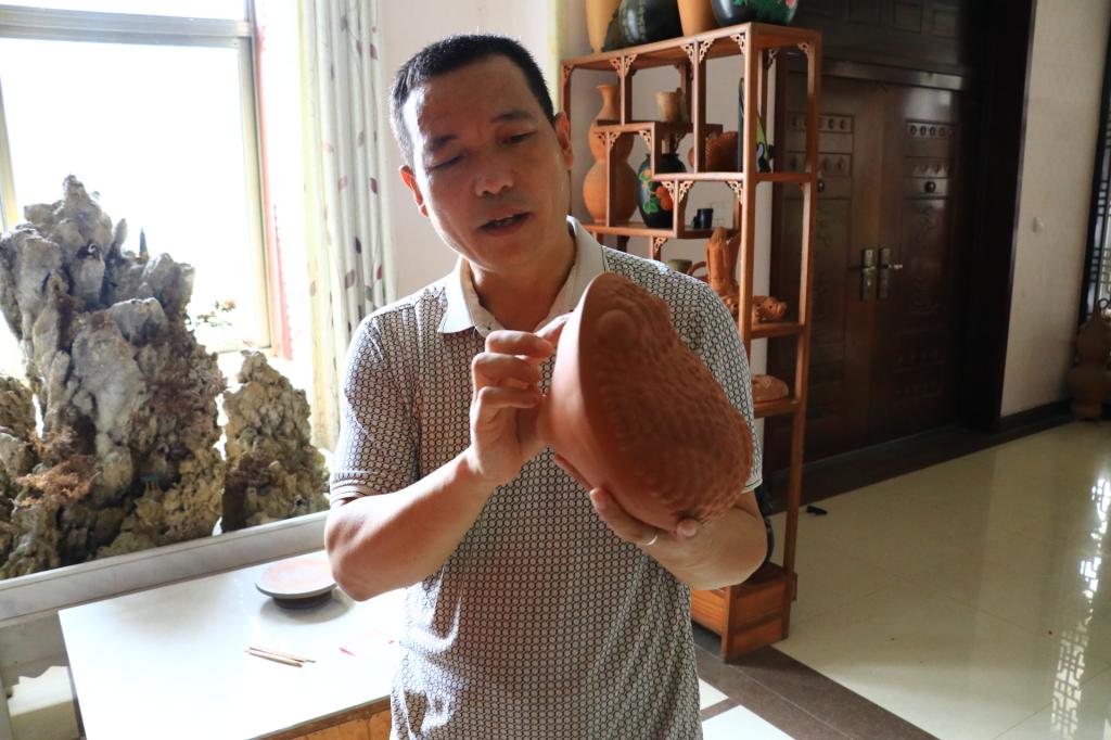 当日上午,队员到达了伏里土陶的传承人甘言地的展览室,根据甘老师的介绍,伏里土陶吸取了各个朝代土陶艺术的优点,具有原始社会新石器时代的型制,浓郁的汉代风韵,南北朝特点,明清吸收其它姊妹艺术长处的印痕等特点,之所以是叫伏里土陶,甘老师解释道,伏里土是我们伏里村特有的,土的粘性、可塑性都非常好,好使好用,可以做大件作品。并且伏里村的伏里土可以烧制成5~6种颜色,都与土有很大的关系。伏里土里含有一种铁元素,烧至一定温度会发出紫红色的光,颜色十分漂亮好看。而且这种土质周围乡村是都没有的,是伏里村独有的。