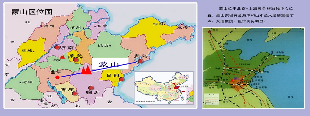 蒙山,古称“东蒙”、“东山”,地处山东省临沂市西北、沂蒙山区腹地。总面积1125平方公里,主峰海拔1156米,为山东第一大山和第二高峰,素称“亚岱”,现为世界地质公园,国家AAAAA级旅游景区、国家地质公园、国家森林公园、世界养生长寿地。蒙山有1000米以上山峰14座,湖泊150多片,蒙山森林覆盖率达98%以上,1999年中科院在蒙山监测空气中负离子含量为220万个单位/立方厘米,为我国最高纪录,被誉为超洁净地区。蒙山悬崖栈道、蒙山寿星山体浮雕、金刚门等设施创下数项世界之最。2014年蒙山被评为全国首座“中国生态名山”,入选《国际旅游度假目的地名录》。2019年4月,联合国教科文组织执行局通过决议,正式批准蒙山园区为世界地质公园。