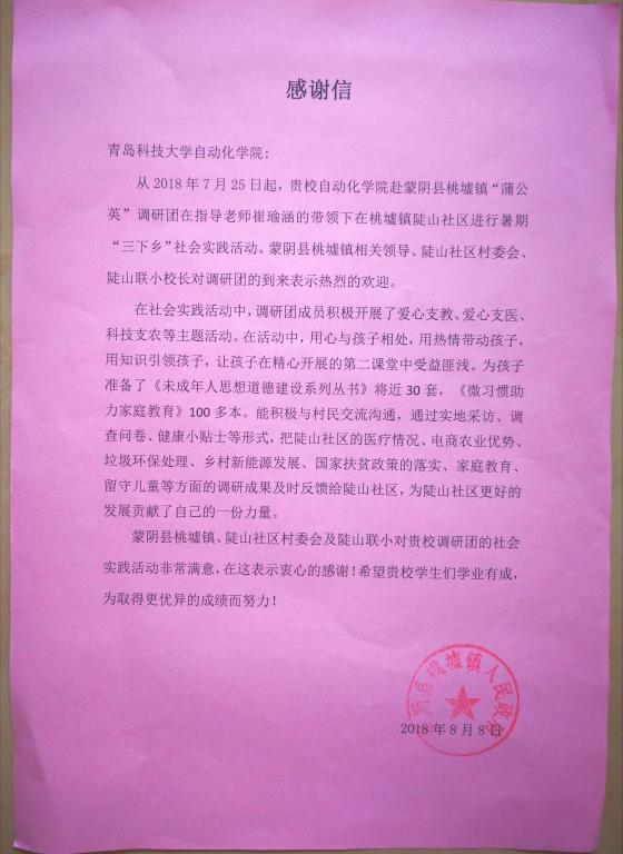 赴蒙阴县桃墟镇“蒲公英”调研团暑期三下乡社会实践活动圆满结束,临走之前,调研团收到了来自蒙阴县桃墟镇人民政府、省发改委第一书记工作队及陡山社区村委会的感谢信,这是“蒲公英”调研团收到最好的“礼物”,因为这是对调研团社会实践期间努力付出的肯定与支持。