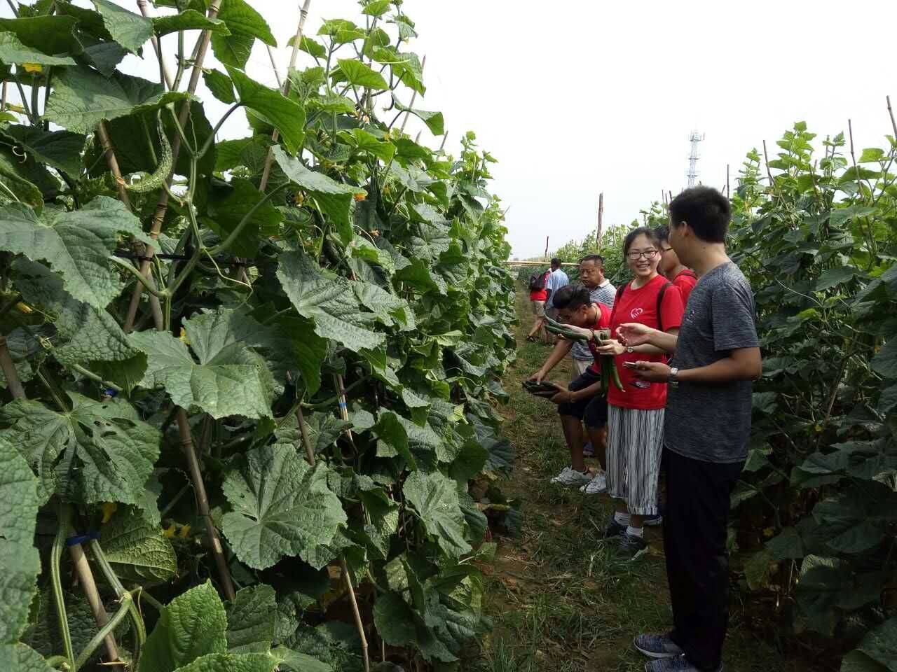 在村干部的带领下,实践团的队员们分别到种植有茄子、黄瓜、冬瓜的大棚里,从源头“追踪”调研茶坡村蔬菜的种植,到田间地头体验生态农业,听村民们讲述无公害绿色蔬菜的生产过程。恰逢村民们在采摘蔬菜,队员们决定帮助村民们采收蔬菜,并进一步检测蔬菜质量。在得到村民们的同意和指点后,队员们都很兴奋,跃跃欲试,纷纷钻进大棚里用农用工具小心采摘着。尽管在密不透风的大棚里队员们需要一直佝偻着腰,手也被刺扎伤,但队员们都选择了坚持。随着汗水一滴滴的落下,队员们的技术也逐渐娴熟起来,收获的蔬菜也变得沉甸甸的。在采摘过程中,队员们通过肥料的施加,蔬菜的质量等方面知道了绿色蔬菜的特点。采摘结束后,队员们抱着自己的劳动成果钻出大棚,看着彼此身上的泥土和汗水不禁笑了起来,把采摘的蔬菜交给村民,一时田间充满了欢声笑语。随后,在村民的带领下,队员们带着刚刚采摘的蔬菜到了茶坡蔬菜市场,参观完了后续蔬菜挑选、装箱等处理。
