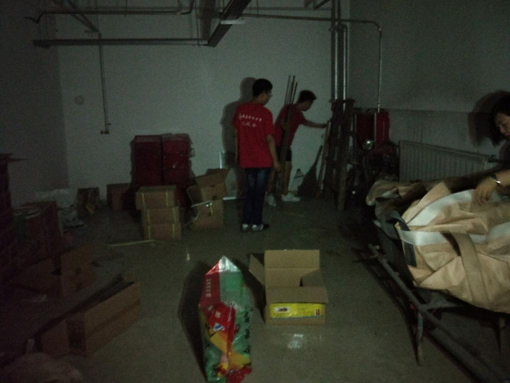 在老人们前来上课之前,志愿者们主动询问是否有杂活可以帮忙。纪主任带领大家进入到地下室中,地下室中没有电灯,志愿者们就一边用手机充当手电筒一边清理着周围的蜘蛛网。室内堆砌着尚未使用过的簸箕、铁锹、消防用品等工具和杂物。他们合理的利用柜子将杂物隔绝起来,清理好地下室内的垃圾和灰尘。纪主任表示,这件地下室原本打算给老人做娱乐的休息室实用,但是因为这些杂物都非常重,需要花费很久的时间才能清理干净,这些志愿者孩子们帮了非常大的忙。