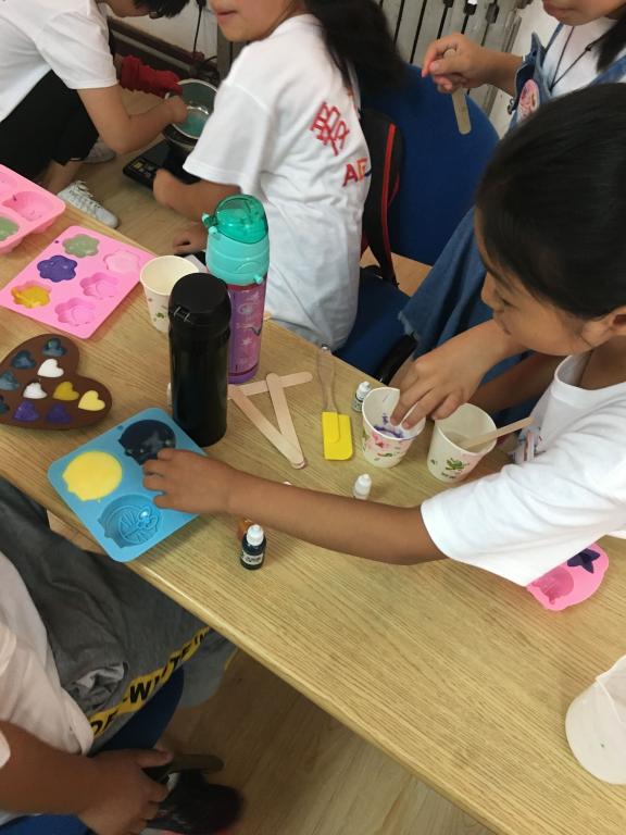 接下来的手工制作便是为明天的义卖做准备,六个小组分成头花装饰品小组,手工皂制作小组,雪糕棍创意小组,画扇子小组和彩绘白T恤小组,孩子们个个心灵手巧,善于利用各种颜料和装饰物,创造出自己最为满意的作品。雪糕棍创意小组的成员将雪糕棍拼成扇子、帆船、木盒等形状,惟妙惟肖而且具有实用性;手工皂制作小组的孩子们利用各种模具将香皂融化并且创新性的制作成各种样子。他们懂得和实践团成员们相互合作,形成了很好的团队意识,进一步增进了和实践团成员们的友谊。