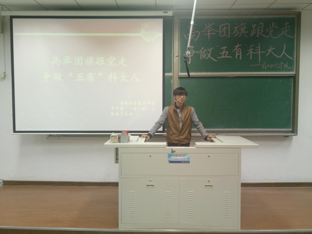 7:00活动准时开始,郭敬宇首先介绍了本次活动的主题:学习习近平总书记重要讲话精神、开展喜迎十九大。简练的开场后,郭敬宇带领大家观看了教育视频《入团第一课》。视频时长约45分钟,通过虚拟表兄妹角色晨轩、雨涵围绕“入团”这一主题的简约故事情节,生动展现了“党的关怀”“团的历史”“身边的共青团”“青年典型说”“加入共青团”等内容。同学们看的很投入,视频结束后,大家纷纷交流观看中的所思所感,总体了解到了党对青少年和共青团的亲切关怀和殷切期望,了解到了团的光荣历史和优良传统,了解到了共青团的品牌工作,了解到了发展团员的基本要求和程序仪式。接着,通过PPT的形式,郭敬宇带领大家学习了2017“齐鲁最美青年”的事迹,这一批模范践行社会主义核心价值观、带头传播正能量,是一批身边好青年,他们可亲可信可学的榜样力量,使不少同学很是感动,决心要见贤思齐、崇德向善,不忘初心、奋力拼搏。活动接近尾声,郭敬宇总结了会议成果,嘱咐大家铭记此次活动,不断思索,在目前岗位上奉献自己作为共青团员的一份力量。
