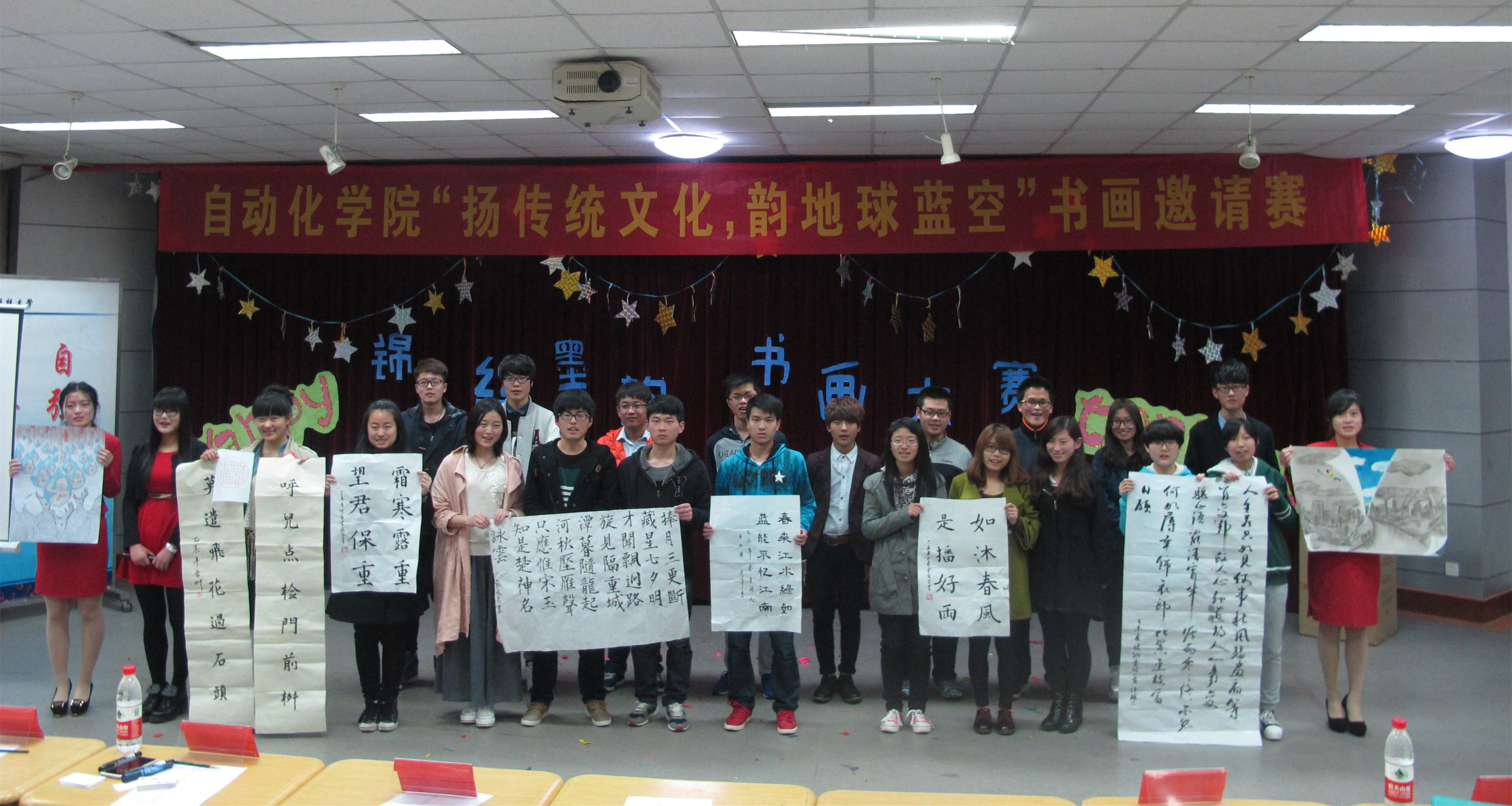 在大学生活动中心举办了以“弘扬中华传统文化,共韵地球蔚蓝天空”为主题的现场书画邀请赛。