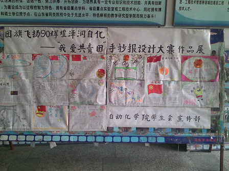 本次活动的主要内容是以班级的形式围绕建团90周年为题自己设计手抄报,主要目的在于希望同学们通过亲身参与手抄报的绘制,对共青团有更深的了解,对共青团这一组织有更深的热爱。通过展板可以看到,各个班级的报纸都别出心裁,从形式上看:有的以鲜艳的团旗为标志同时以红色作为主色调,展现出热情向上的风格;有的则以醒目的“90”作为背景,着重强调九十周年这一值得纪念的时刻。从内容上看:每篇报纸的内容虽不尽相同,但小小的报纸中凝结的智慧与努力,以及体现出的大家对本次活动的重视以及对建团九十周年之际对共青团的热爱之情却是相同的。