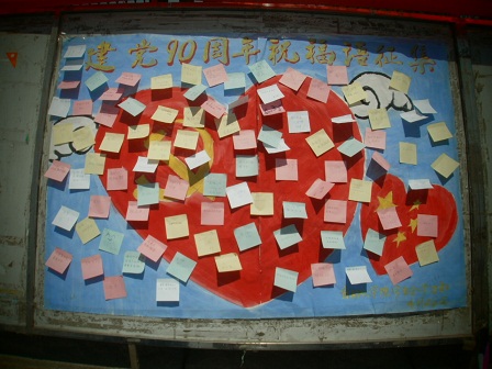学习部举办这次活动旨在激发广大同学的爱国情怀,增强同学们对党的热爱与拥护,是同学们表达自己对党的热爱之情的良好平台。在活动现场,学习部的各个成员各有分工,有的向同学们传达此次活动的意义,邀请每一个同学留下自己对党的真挚祝福,有的在为同学们提供书写祝福语的小卡片,有的为同学们提供笔,整个现场一片欢乐祥和的氛围。今年正值中国共产党建党九十周年,我们党带领全国各族人民,在社会主义的宽广道路上走过了风风雨雨的九十载,创造了一个个值得国人骄傲的成果。这次活动正是出于对党的深厚热爱而举行的。活动持续了一个多小时。