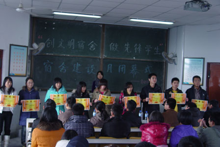 下午一点整,主持人宣布第一届“创文明宿舍,做先锋学生”宿舍建设月闭幕式正式开始。首先,主持人宣读了舍徽创意设计大赛获奖宿舍的名单,由嘉宾为获得荣誉称号的宿舍舍长颁奖;然后,主持人又宣读了五星宿舍获奖名单,并由嘉宾为获得此荣誉称号的宿舍的舍长颁奖。