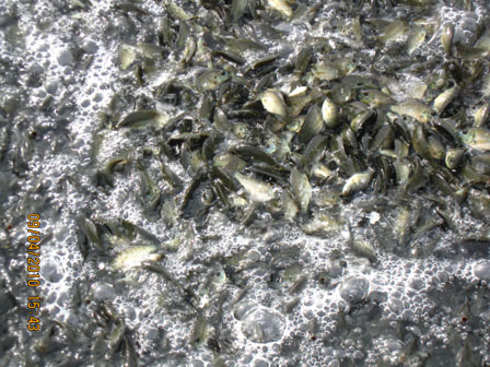 参观是极富情趣的。有的男同学撸起袖子,想抓住罗非鱼,可是那重达十三、四斤的大鱼非常机警,空扑了下去,没有捞着;女同学们抓起池边的饲料往池中撒去,顿时水面沸腾,鱼群争相赶来抢食,一时间只见黑压压一片鱼头。