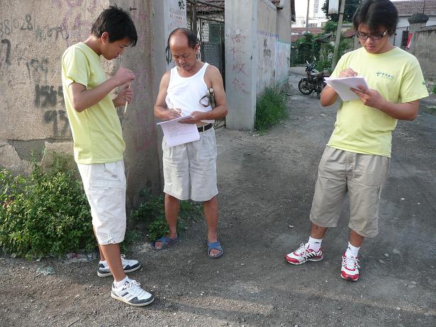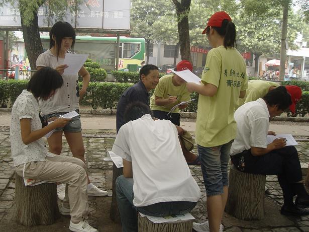 此后,实践团在实践服务调研期间,在新泰市内、新汶街道办事处、新泰开发区、社区、农村、工厂等地开展了“中华人民共和国成立六十周年我的身同感受”调查问卷主题团日活动。共发放调查问卷500份,内容包括个人信息和个人认识两大部分。个人信息包括年龄、性别、职业、收入状况、家庭情况等情况。个人认识则从多角度、多侧面对中华人民共和国成立六十周年以来,“我”的身同感受进行了调查。包括对目前生活状况、所在社区(或农村)基础设施、公共服务的满意程度,对制约本地经济发展问题的认识,对中华人民共和国成立六十周年最大的感受,下一步改革重心应该放在哪里等宏观问题。调研中,对他们不理解的内容,实践团耐心详细的进行了解释,并对识字有限的农民,或者花眼的大爷大妈进行了解读。