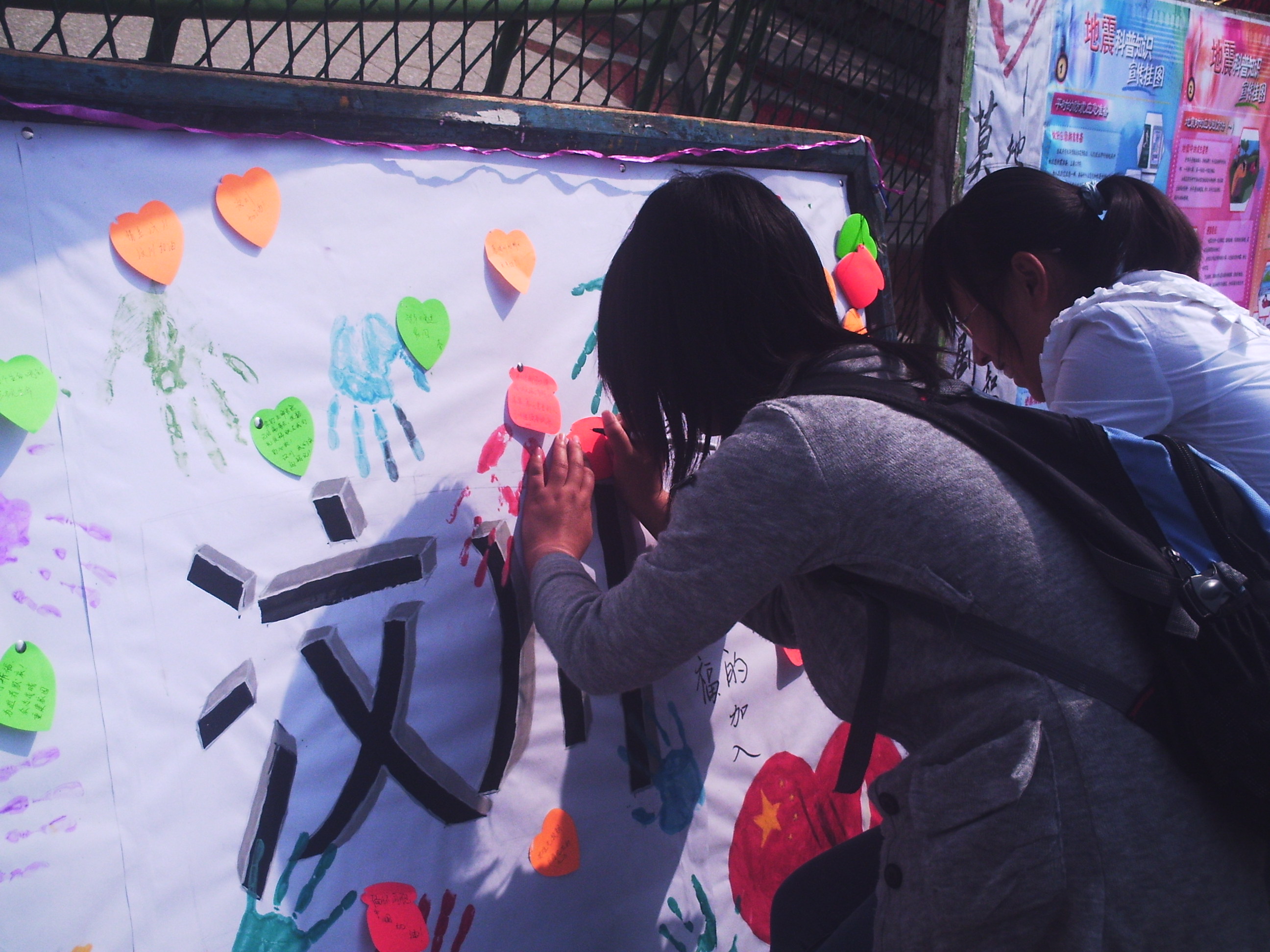 此次活动中,同学们表现得非常积极,大家都将自己内心“为5.12哀恸,祈望未来”的心声用文字表达出来,希望着片片心形的纸片能够飞到四川,飞入同胞的心中:四川加油!中国加油!