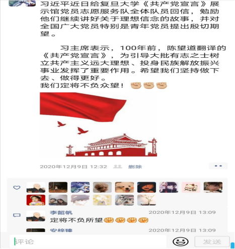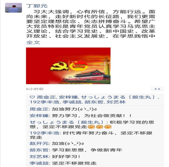 团支部全体成员一起观看了《共产党宣言》解读等视频,在学思践悟中坚定理想信念,在奋发有为中践行初心使命。同学们以宿舍为小组集中学习了新中国史、改革开放史、社会主义发展史等内容,并通过朋友圈等线上平台发表了自己的学习心得。