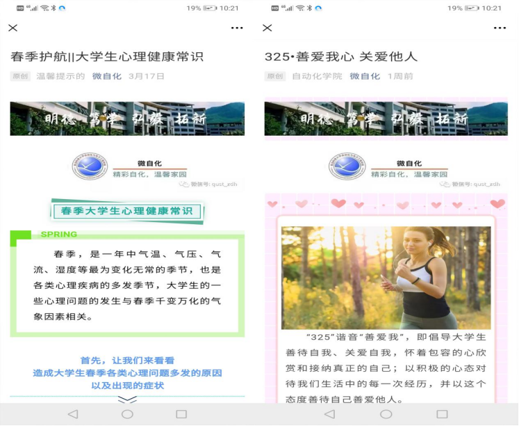 常识普及,防患未然。通过“微自化”平台推出多篇心理自护推文,提醒大学生关注春季心理健康,从“为什么、是什么、怎么办”三个维度向大学生详细的介绍了春季的常见心理问题,循序渐进地为学生答疑解惑,在保证大学生身心健康发展方面突显实用性和高效性。