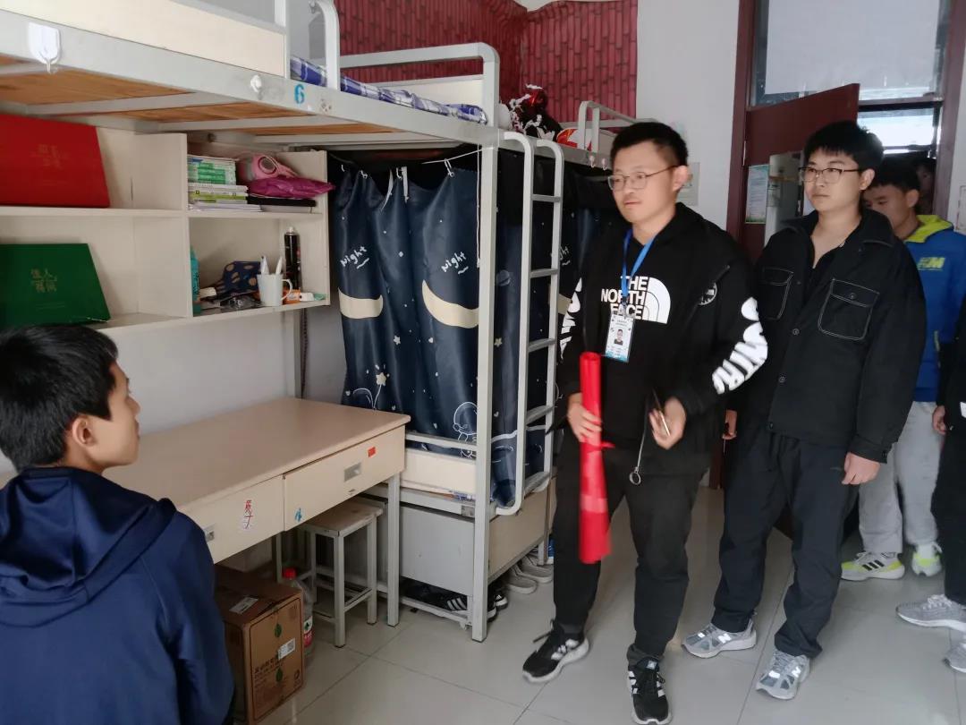成员带领检查北苑二号楼和三号楼宿舍。成员们各司其职,认真检查物品摆放,不放过任何角落。并对发现的问题及时指正,努力做到早发现,早解决,消除细微安全隐患。同学们在检查过程中积极配合工作,认真改正安全隐患问题。
