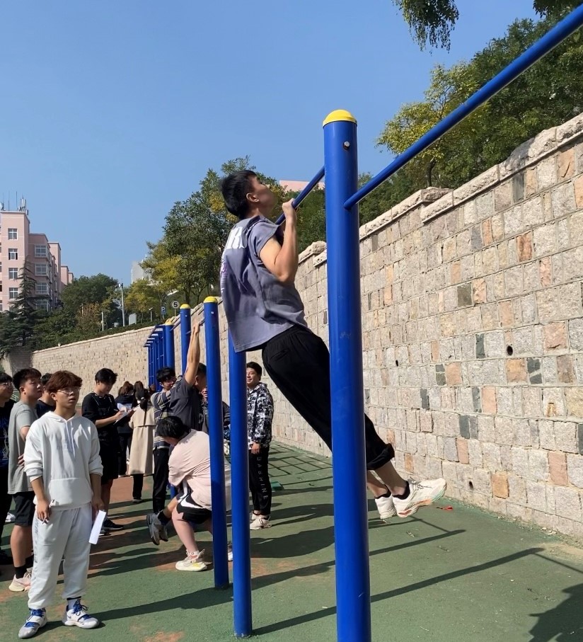 随后崔清成同学为大家展示了体能训练成果——引体向上标准动作及力量展示,这一动作是力量与美的结合,考验上肢力量与身体核心的巧妙配合,展示及教学过程中,他的表现认真自信,他的动作刚柔并济、一气呵成,全班同学认真学习并谨记动作要领于心中。随后,体能类项目正式开赛。参赛选手们摩拳擦掌,状态满满,在引体向上项目中奋力拼搏,争夺名次。最终,崔清成以一分钟27个的优异成绩夺得冠军。