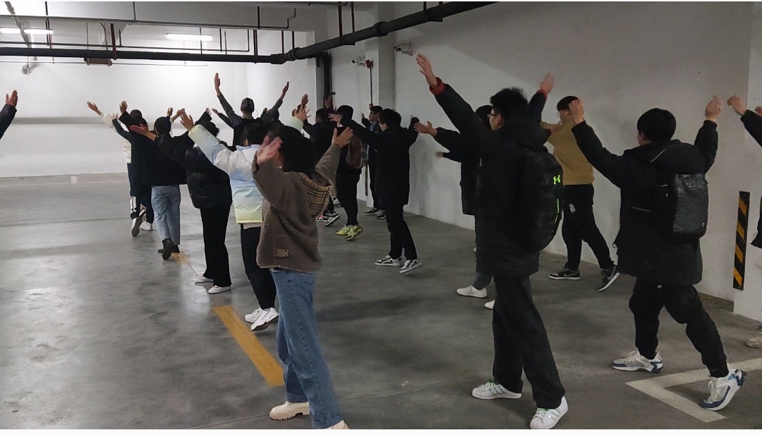 地下车库举行个人广播体操比赛。