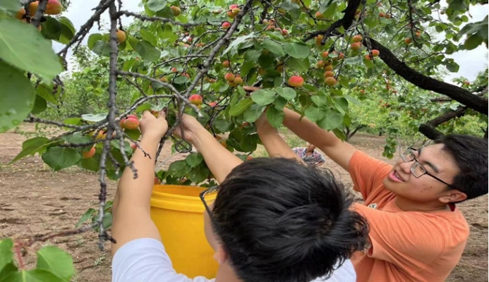 活动伊始,团队成员在当地相关负责人的带领下来到杏园进行实地考察,向果农们了解杏的生长、销售情况,团队成员帮助果农采摘成熟的杏并对其进行分拣。