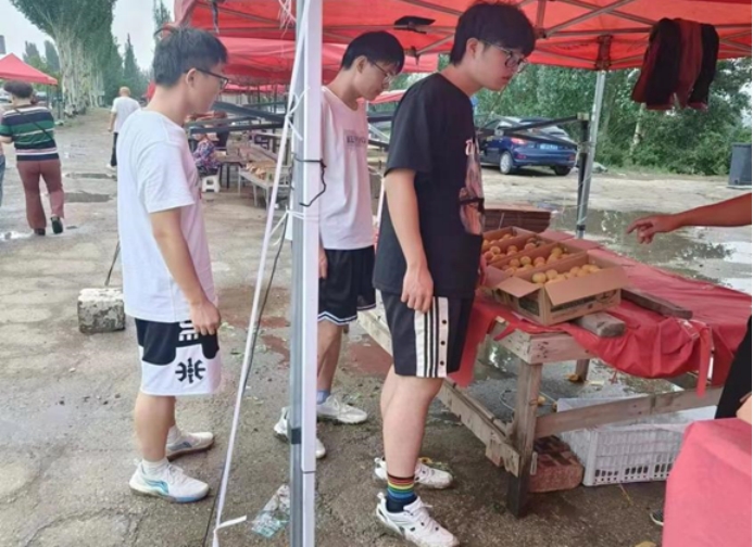 随后,团队成员来到了当地的杏果交易市场,进行更深入的考察与调研。据了解,当地的杏果产业比较发达,果农们将自家采摘好的杏果进行挑拣等简单处理后,一部分拿到当地的交易市场进行售卖,另一部分品质好一点的杏果则通过电商等方式售卖到各地。因此,他们对于质量的检测标准尤为重视。活动过程中,成员们主动帮助果农售卖他们的杏果,并对需要寄件的杏果进行筛选与包装。