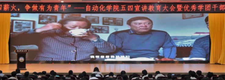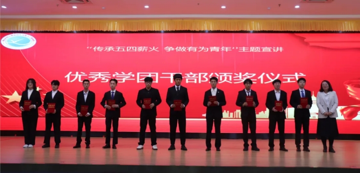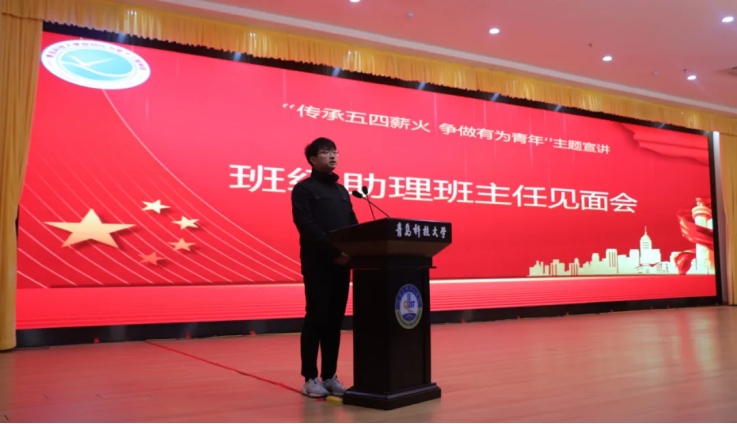 于崂山校区第二报告厅举办“传承五四星火 争做有为青年”五四宣讲教育大会暨优秀学团干部颁奖大会,学生工作处教育管理科科长郭蒙蒙、Netflav