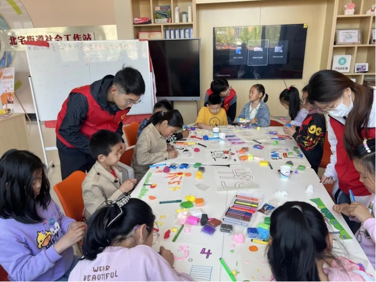 星火义工队积极响应团中央号召,联合北宅街道团工委,走进北宅街道社工站开展“青春热忱护童心”暨“五四”青年节志愿服务活动。