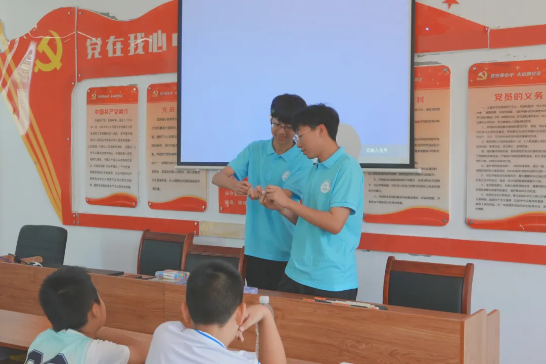 学子组成的队伍,他们结合自身专业打造了独特创新的实验课堂,让科创课成为了此次支教活动的亮点之一。为了给孩子们带来生动有趣的物理小实验,他们一早准备好实验道具,借助马德堡半球实验,让孩子们真正感受到大气压强的神奇力量。同时为提高孩子们的参与感与动手能力,志愿者带领他们亲自动手操作,让孩子们在实践中感受物理实验的魅力。这堂科创课不仅激发了孩子们的科学兴趣,还让他们相信自己未来定能够用自己的智慧点亮科学的星空。