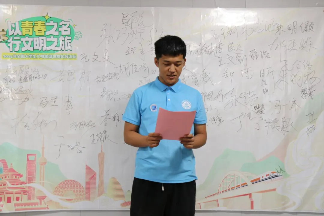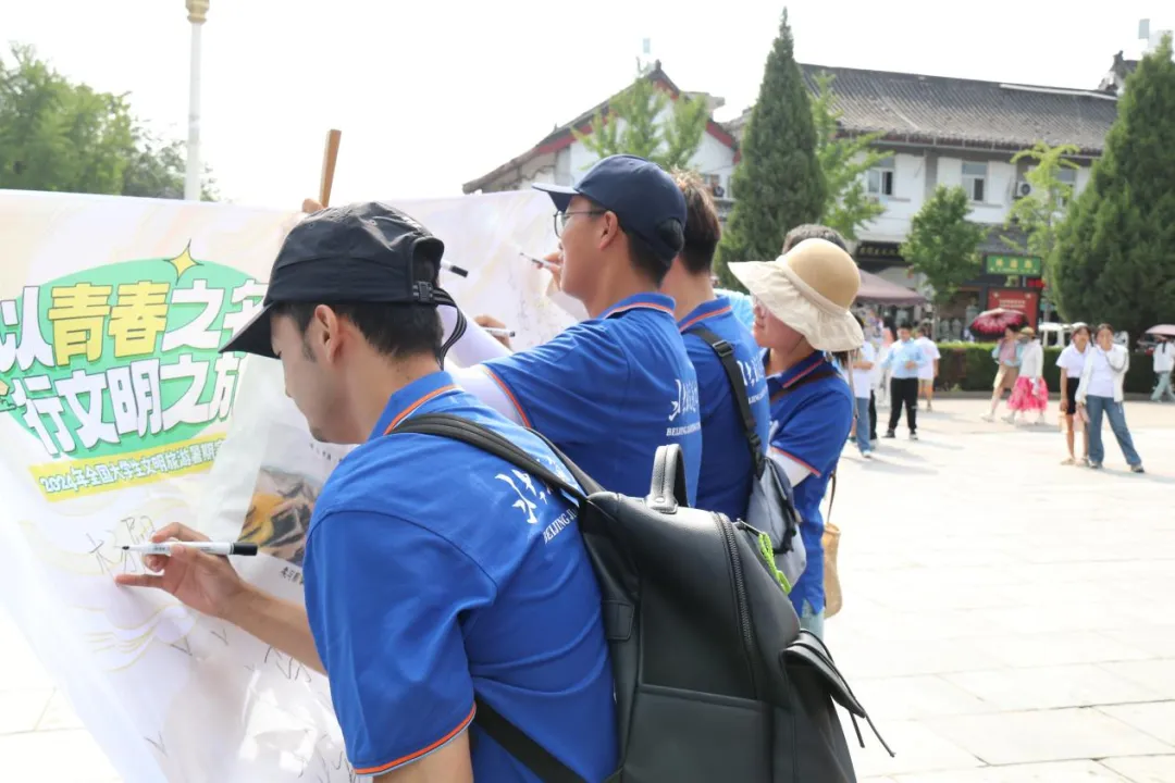 实践团成员设立了签名墙,并邀请北京交通大学社会实践队成员进行签名交流,在文明旅游宣传讲解过后实践团成员邀请游客留下签名,以更好地展示其对文明旅游的支持态度,得到了游客积极响应。现场还与北京交通大学的少数民族同学进行深学习交流学习,共同对推进宣传文明旅游并提出自己见解与看法。