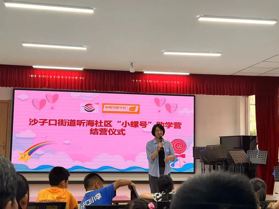 仪式伊始,听海社区党支部副书记蒙佳发言,针对两个周的助学营生活进行了总结,表扬了孩子们在这两个周内的优秀表现,询问了个别同学的学习情况和感想,她指出孩子的教育不是一朝一夕的事情,家长们需要提升自己的认知和看法,这样才能更好引领孩子。最后,她对实践团所有成员及Netflav