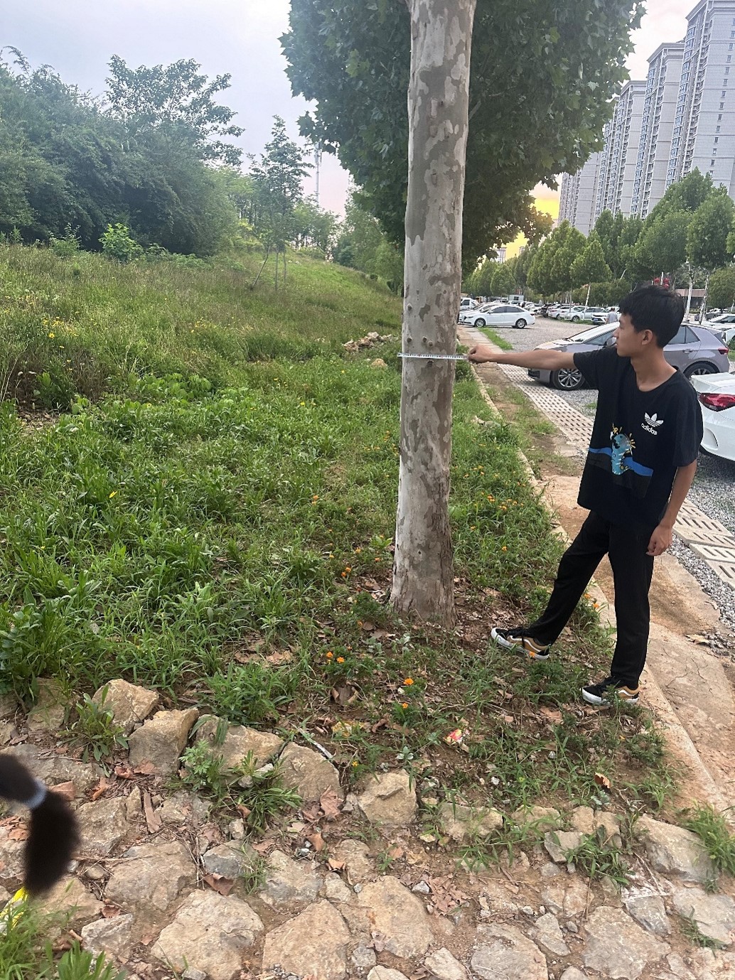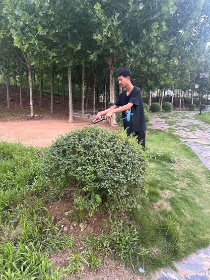 孙瑞泽被分配到区市政园林服务中心开启为期数周的实践,他带着对家乡的赤诚与专业知识,从苗木养护到文化传播,在基层岗位上完成了 “理论 — 实践 — 服务” 的闭环,为家乡园林事业注入青春动能。孙瑞泽的日常工作充满 “专业感” 与 “行动力”,每天清晨,他都会携带胸径尺、修枝剪、病虫害检测工具等装备,准时抵达苗木管护区域。在巡查现场,他遵循 “先诊断、后施策” 的原则:先是逐株细致排查,查看叶片是否有病虫害斑点、枝条是否存在徒长或枯萎情况;接着用胸径尺精准测量树木胸径,记录不同树种、树龄的生长数据,精准记录缺损苗木的种类、规格和位置,为苗木补植积累基础资料;对于判定需要修剪的苗木,他则依据 “疏剪、短截” 等专业修剪技巧,小心翼翼地修剪病弱枝、交叉枝,既保证苗木造型美观,又减少病虫害传播风险。