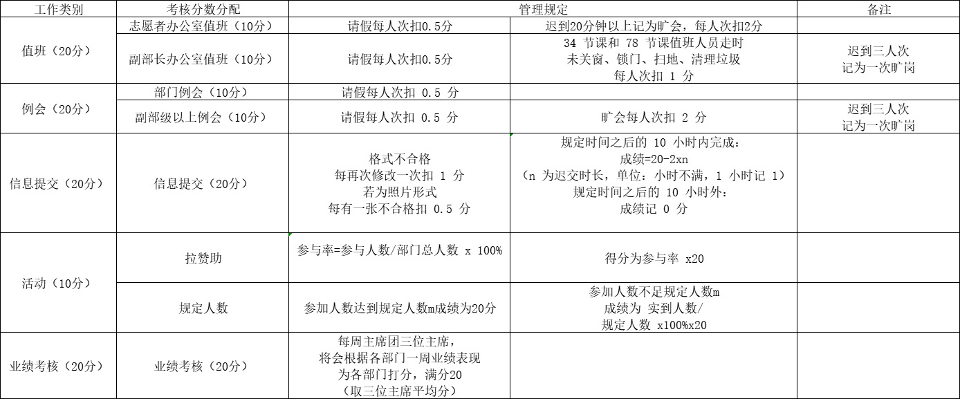 为了加强学生会的自身管理,更好的提高学生会的工作效率和工作积极性,进一步加强对学生会各部门的管理,检验各部门的工作成果,特制定学生会部门考核制度,其内容如下: