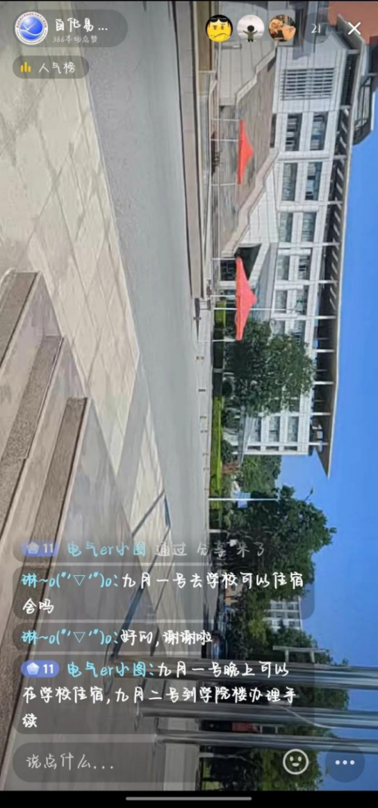 功能区域分布与魅力景观。直播期间,新生们通过评论区互动实时提出问题困惑,获得学长学籍们的及时答疑。为帮助新生们更高效、便捷地于报到当日办理相关手续,学长学姐们还悉心讲解了报到区域、报到流程、志愿者岗位设置、家长休息区等迎新安排,鼓励同学们错峰出行,有序报到。
