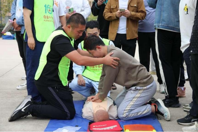 林慧艳主任对“白金十分钟项目”进行了详细的介绍,她表示近年来高校心源性猝死案例多发,每个人都应该掌握好急救知识。张丰铎副主任向同学们讲解了心肺复苏的正确操作方法以及注意事项,并演示了自动体外除颤器(AED)的使用。顾晓峰副主任向与会者讲解了海姆立克法急救法的正确姿势,并强调了其中的注意事项。